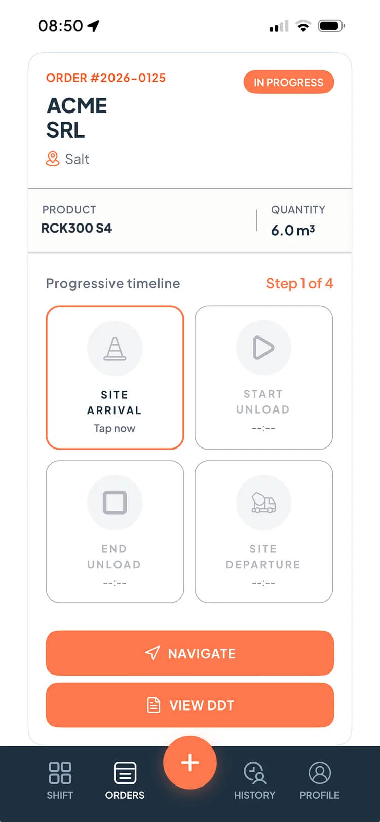 From assignment to delivery, every step is tracked: site arrival, start unloading, end unloading and departure.