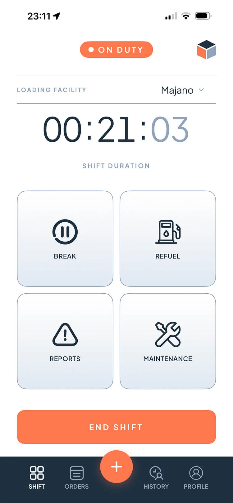 Drivers start and end shifts with a single tap. The app automatically records vehicle, facility, odometer reading and GPS position.